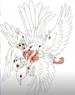 The Dove kKng looks as if someone took three white doves, half melted them, then fused them together. It mainly hunts the rats and small raccoons. They don’t seem to have healthy internal organs, instead reproducing by tearing a piece of themselves, which then grow into their own Dove King