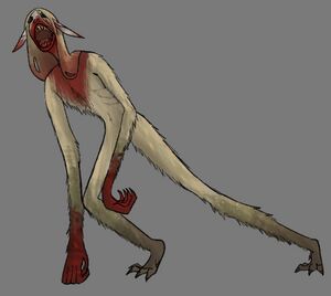 The Creature's true form is a tall, hairy creature with long arms, a large mouth, and small eyes. It is unable to speak without magic.